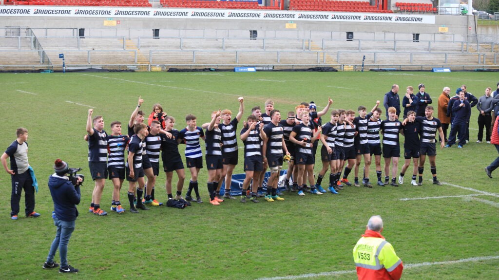 Photo: A Jubilant Wallace HS 1stXV after their 22-17 Schools’ Cup Semi-Final Victory over MCB at Kingspan