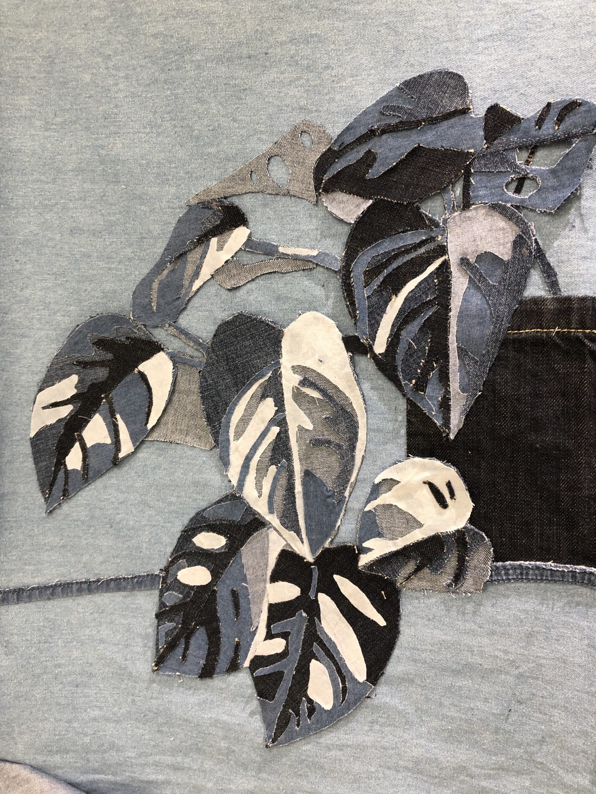 Following a request to staff for discarded denim Y13 students created a galaxy of attractive pieces building the work in layers of monochromatic tones. It has even provided a new game…Spot your denim!