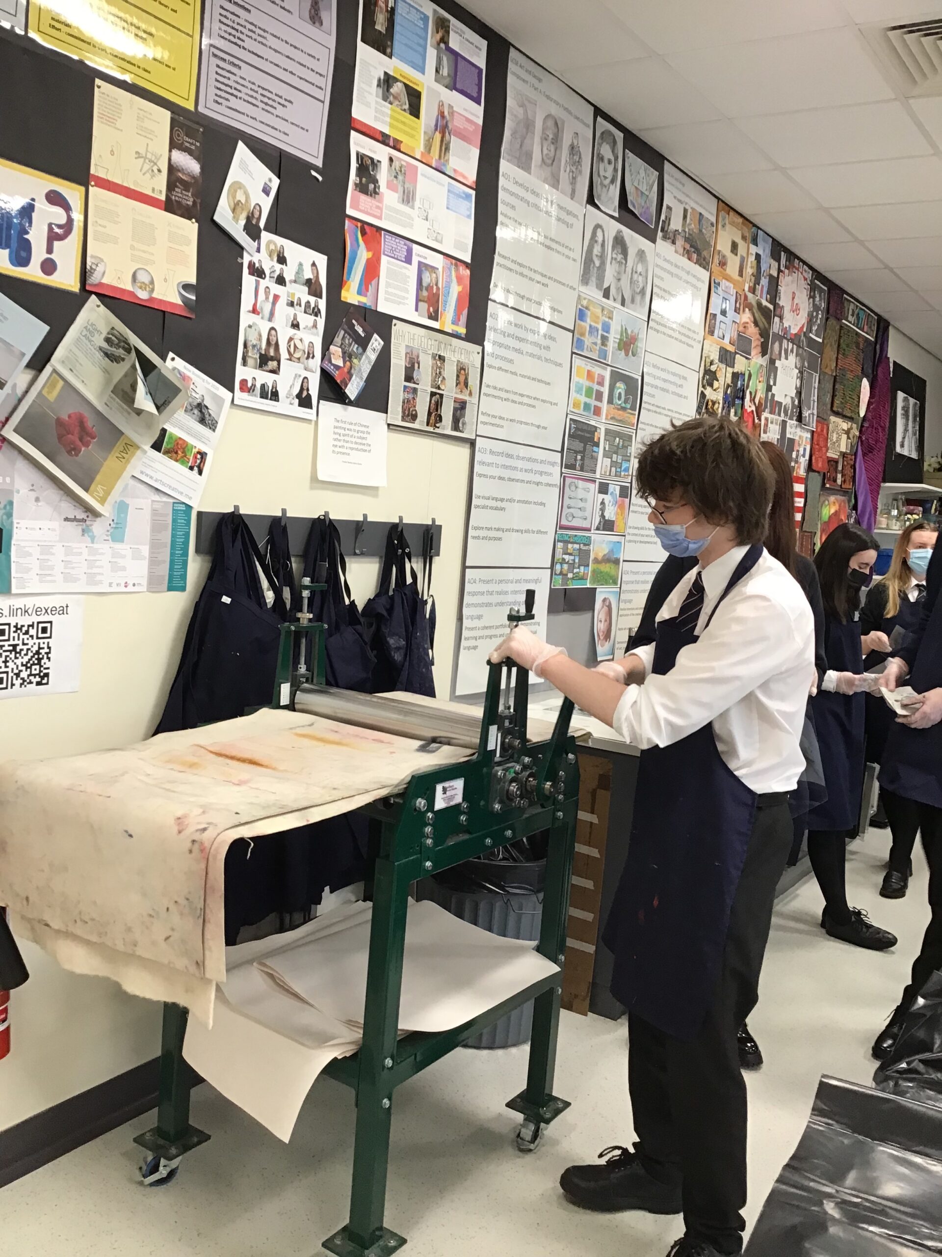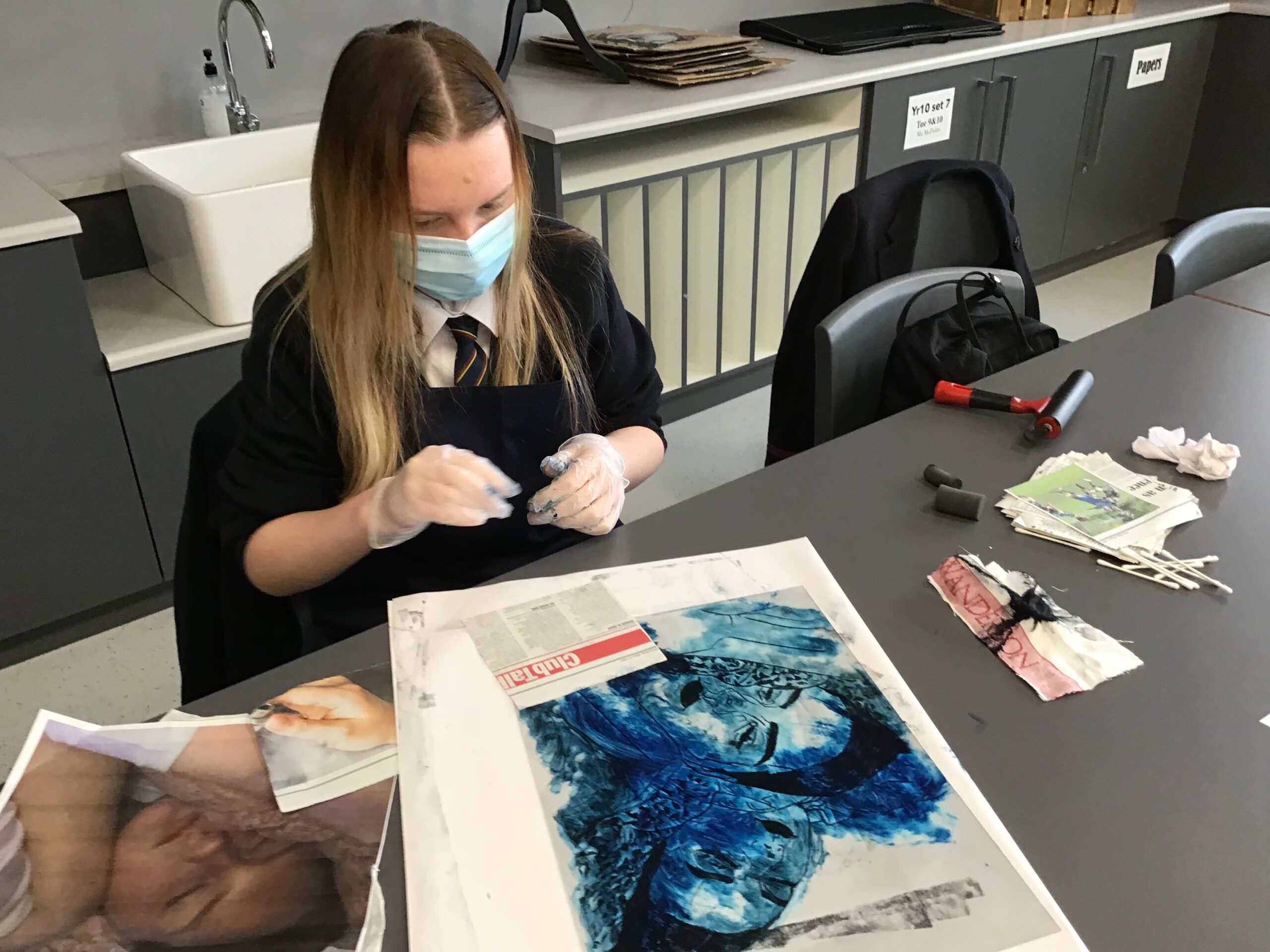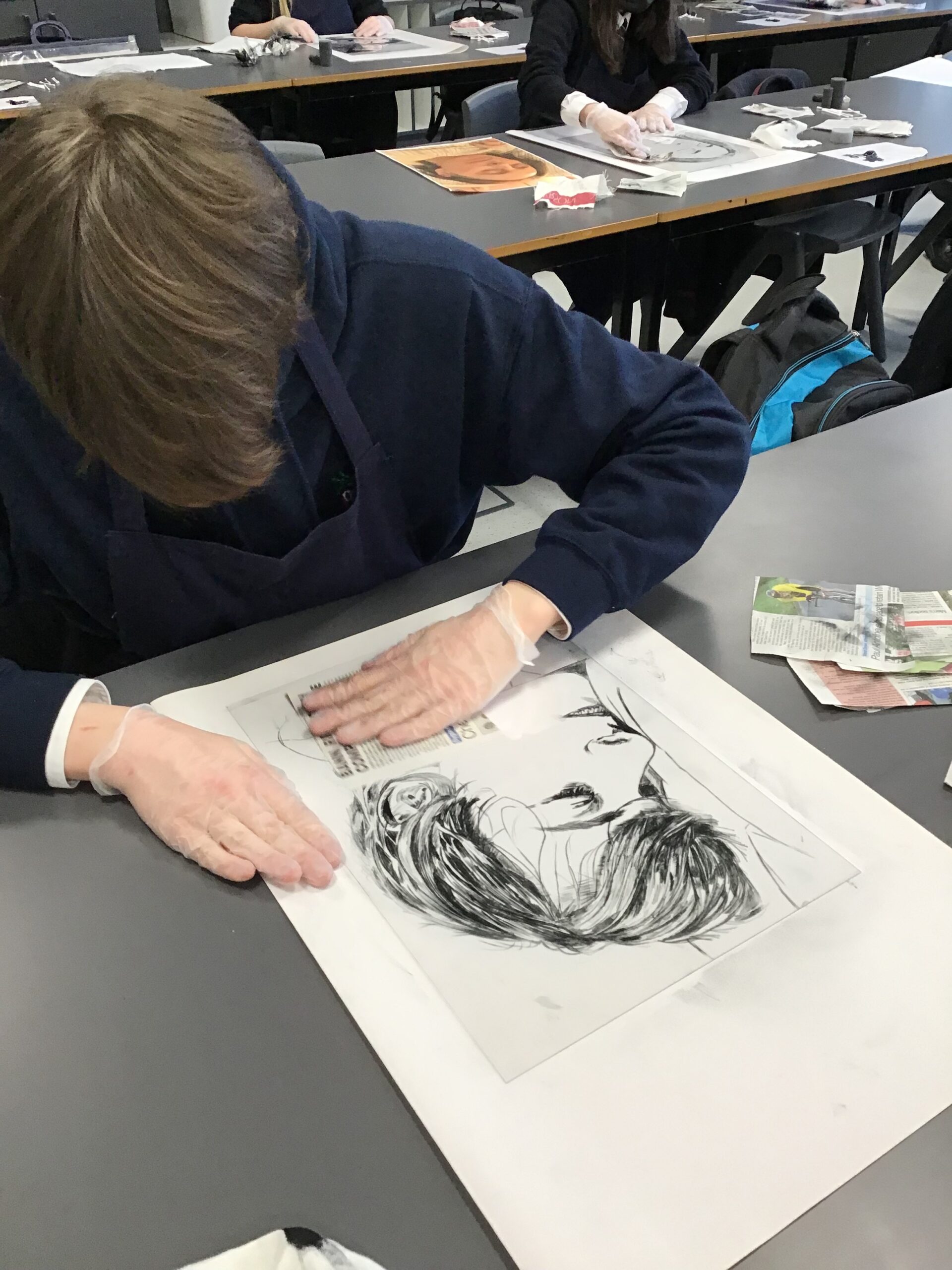 A Level Art students gain experience of a wide repertoire of techniques during their studies and the workshop was an invaluable opportunity to learn about printmaking and in particular about the process of intaglio printmaking. Intaglio is the opposite of relief printing and Drypoint is the most accessible of the various styles available to an artist. The pupils prepared a clear acetate plate prior to the school visit by placing it over a photograph and then scored the surface with a scribing tool. The scored areas hold the ink and the deeper the scores, the darker the eventual tone; white areas are not scored. During the inspirational visit the students were shown how to prepare the paper for printing,  how to ink and polish their plate and how different tools created variation in tone and texture.