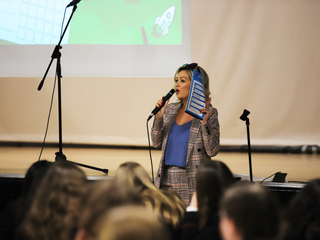 The event was led by Rebecca Wright of Young Enterprise who has enjoyed an interesting career path. Having originally trained as a Business Studies teacher, Rebecca has worked in the charity sector and for the National Trust. She noted that the recent trend of many companies providing “ volunteer hours” for their staff has given the work of Young Enterprise a great boost, a fact that was clearly demonstrated by the very warm reaction of Year 9 to guest presenters Samara Prentice and Rory Stewart. Both Samara and Rory referred to their happy memories of Wallace, noting some of the key skills the school had nurtured in them with Samara observing that “ Wallace was amazing in teaching you to be resilient.”