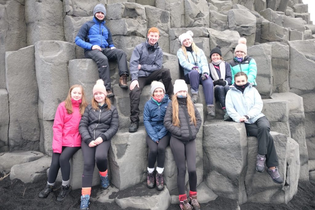 Day two began with an early start and breakfast served out of a Viking boat. With quite a heavy snowfall on the ground, the tour of choice was the South Shore Adventure. When the group hopped off the bus at the first stop, they had quite a walk ahead of them. The icy surfaces and tentative steps were more than worth it for the sight that beheld them at the end; the Solheimajokull glacier. Unfortunately, the glacier is retreating at more than 100 metres a year and the difference in its appearance since 2017 is vast. However, the glacier has still managed to retain its vibrant blue colour and this stop proved to be a spectacular start to our second day in Iceland. Moving further along the South coast the next stop for the group was Reynisfjara beach, where impressive basalt columns rival those of the Giants Causeway. After a few attempts at snow angels in the black sand, it was time to hop back onto the bus and head towards the quaint town of Vik. Little did the group know, some of Iceland’s most popular waterfalls were yet to greet us on the return journey. It is difficult to put into words just how incredible the Skogafoss waterfall is and it could be suggested that even the pictures do not do it justice. The group was up to the test however and spent plenty of time trying to get the perfect selfie in front of the 60m drop. Not many of our young people would have expected dancing to form part of the Icelandic tour, but Albert was insistent on performing a traditional Icelandic dance in an old community cave as our next activity. Mr. Atkinson will be delighted that no phones were available to capture this moment; the group was too busy holding hands, singing and mastering steps only familiar to Icelandic folk in generations past. After a final stop at the Seljalandsfosswaterfall it was time to return to the hotel. The Domino’s pizza and ice cream purchased after our two course meal in the hotel acted as a friendly reminder of just how many steps had been covered on day two!