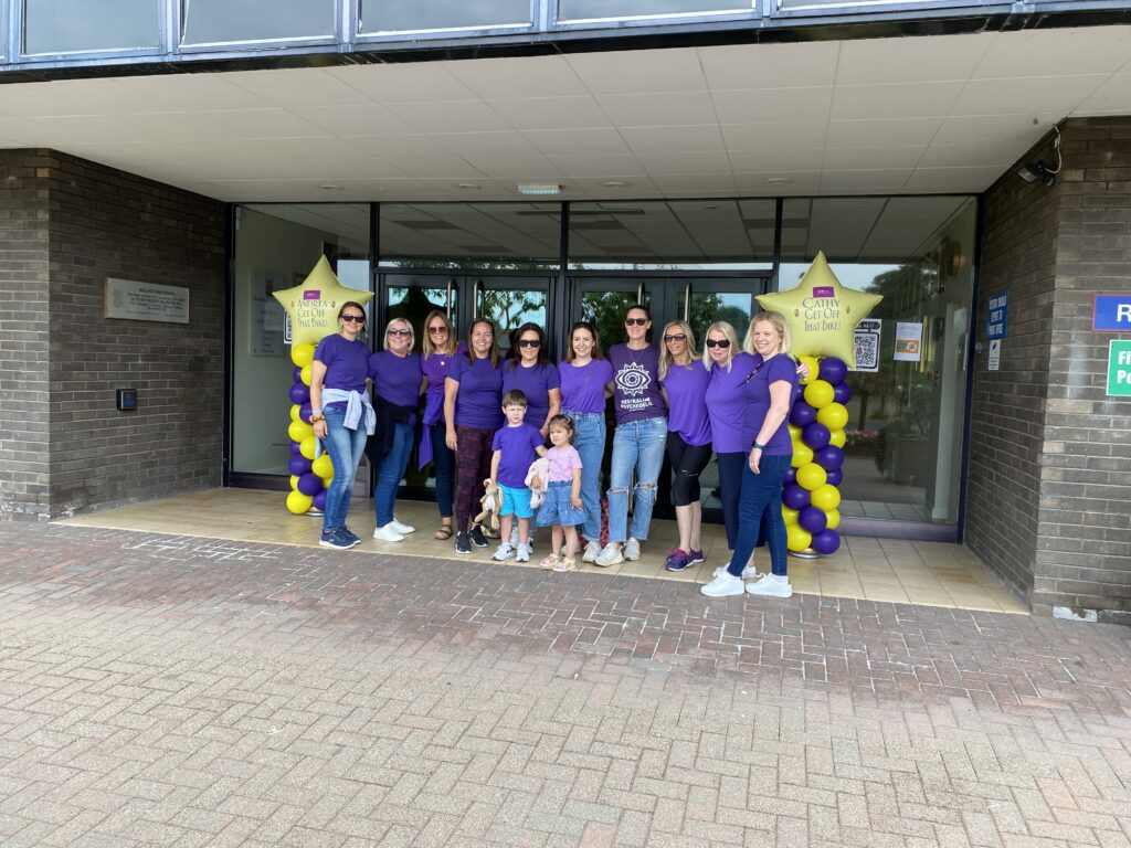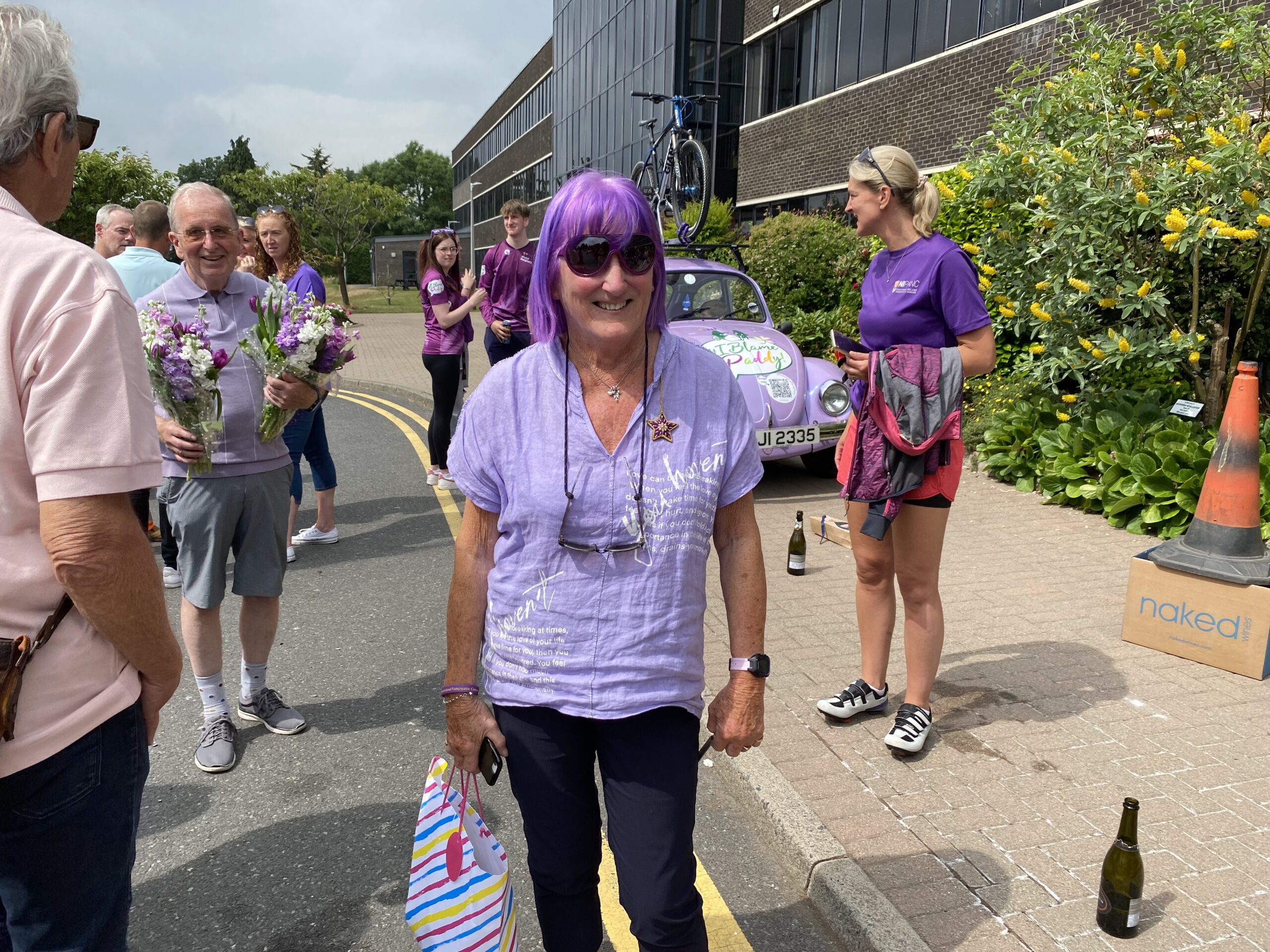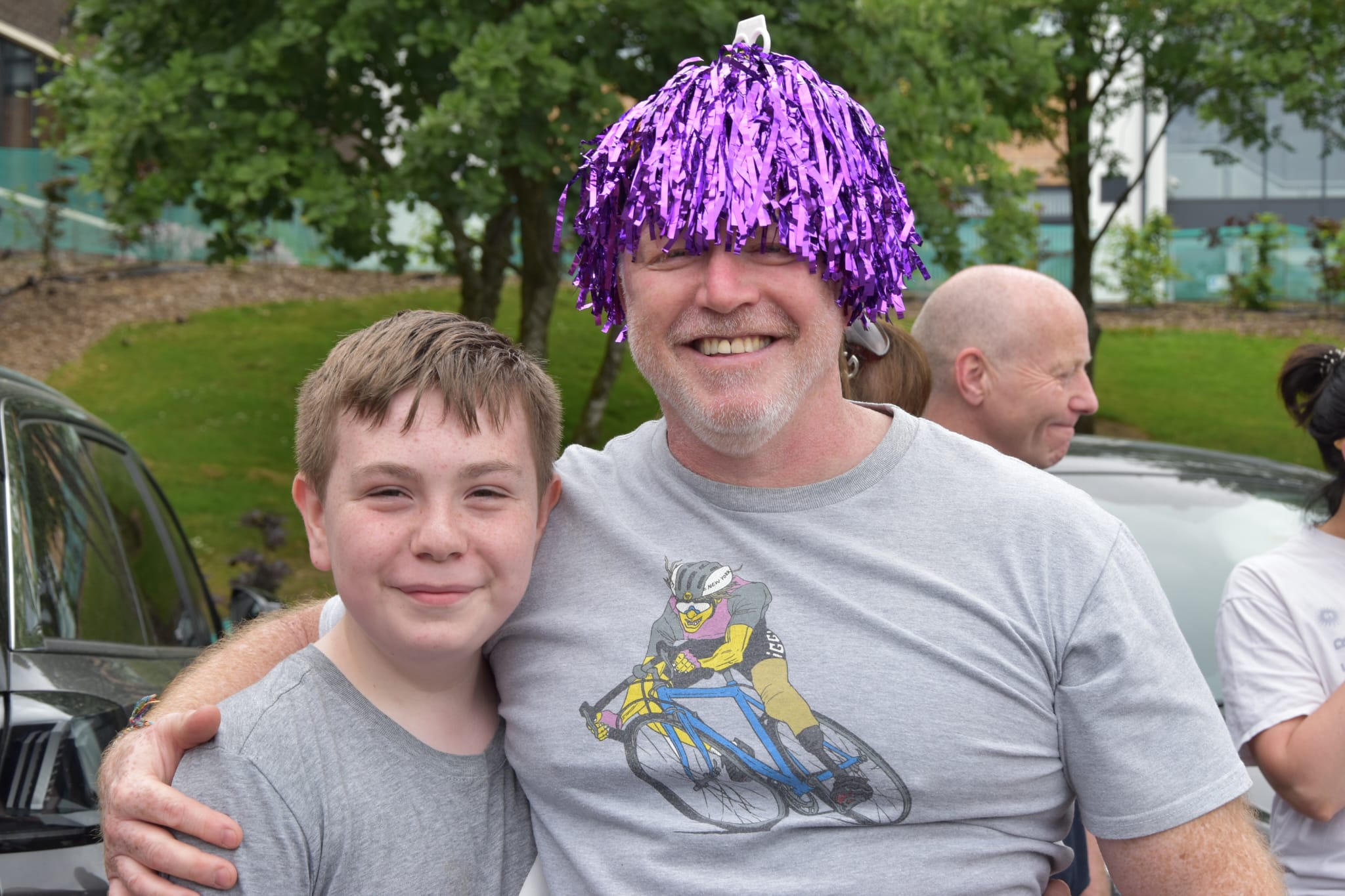 The Wallace car park was a sea of purple with particular highlights being the inflatable suit (well done, Fiona) the purple hair, purple nails, the purple VW Beetle and the specially commissioned balloon pillars with personalised stars! Young, old and all ages and stages in between watched and listened as the girls lapped the car park to the strains of Green, Green Grass by George Ezra which had been the final serenade for Andrea’s late husband, Paddy at the celebration of his life held in Wallace last year.