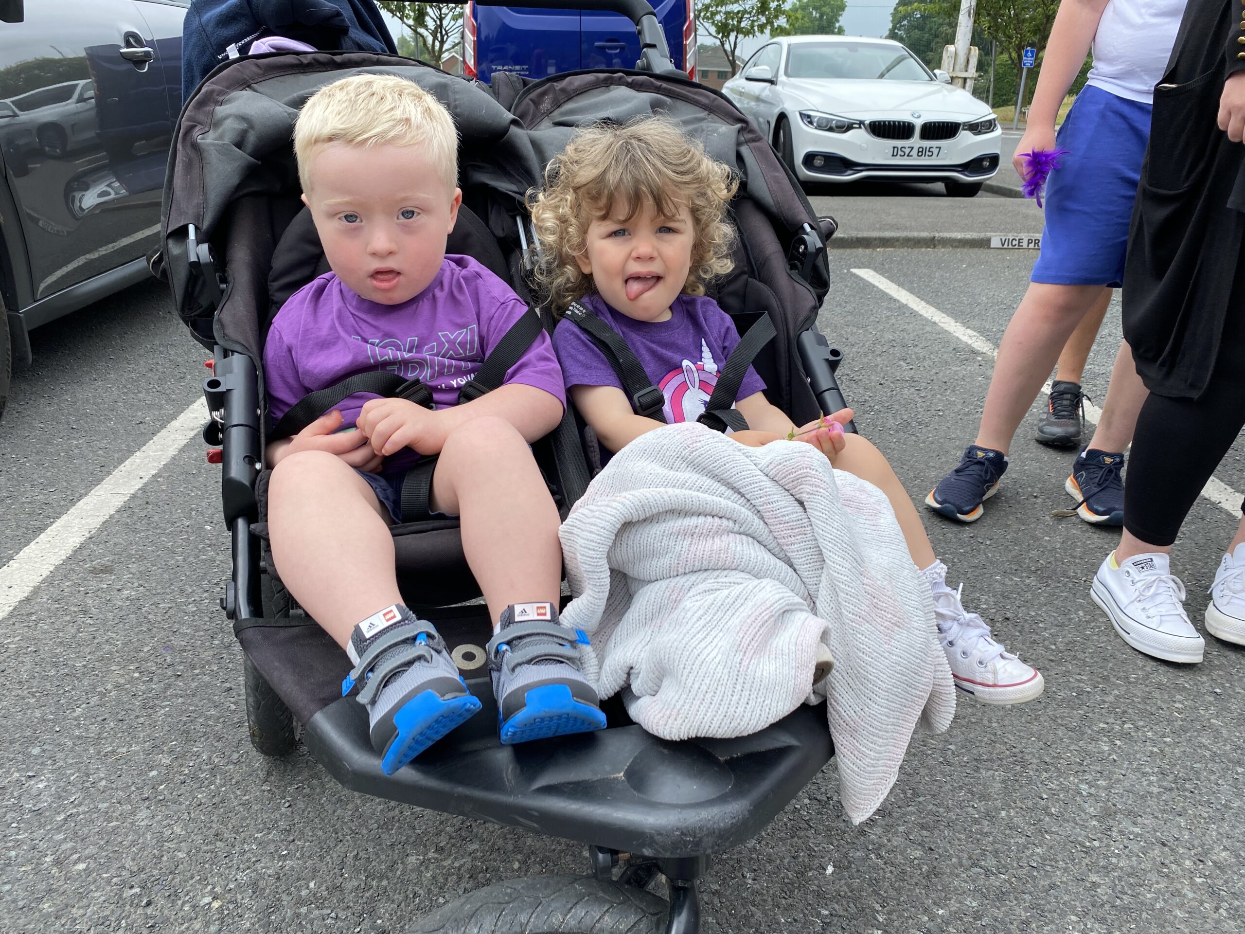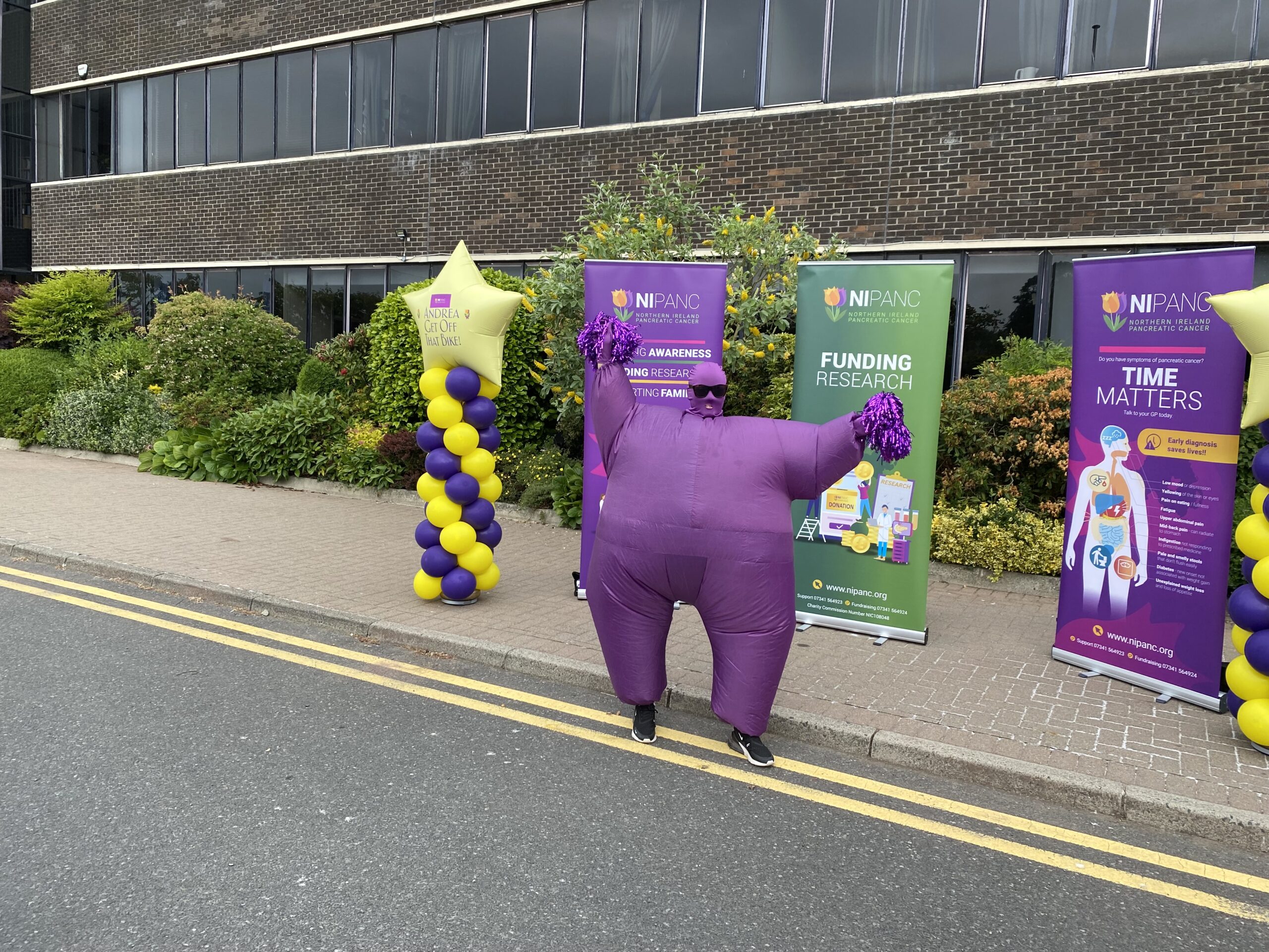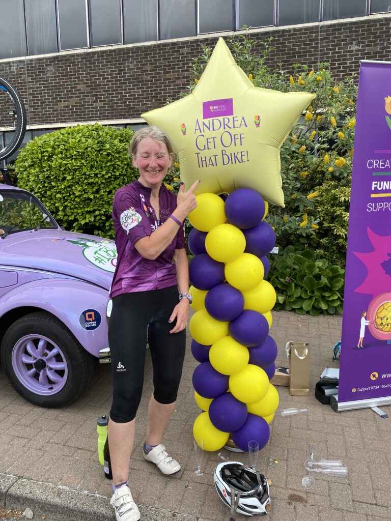The Wallace car park was a sea of purple with particular highlights being the inflatable suit (well done, Fiona) the purple hair, purple nails, the purple VW Beetle and the specially commissioned balloon pillars with personalised stars! Young, old and all ages and stages in between watched and listened as the girls lapped the car park to the strains of Green, Green Grass by George Ezra which had been the final serenade for Andrea’s late husband, Paddy at the celebration of his life held in Wallace last year.