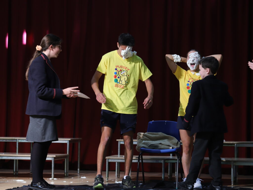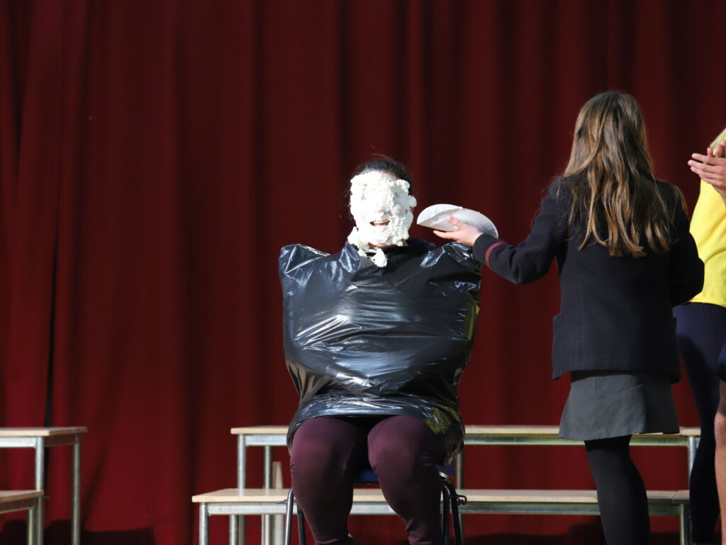 Years 8 & 9 had the pleasure of attending the Pudsey Games in the Assembly Hall which saw pre-recorded material featuring the Senior Prefect Team, a live Stack the Cups challenge, raffle results and the much anticipated cream pie fun. As befits the responsibilities of leadership our Head Boy and Head Girl, Josh and Samia, “took one for the team” and discovered the value of full fat cream for the complexion. Physics teacher, Mrs Wendy Davison, heroically stepped up for the staff and there’s no doubt that Seth Bovis, Rosie Boyd and Isabel Duncan enjoyed their moment in the limelight.