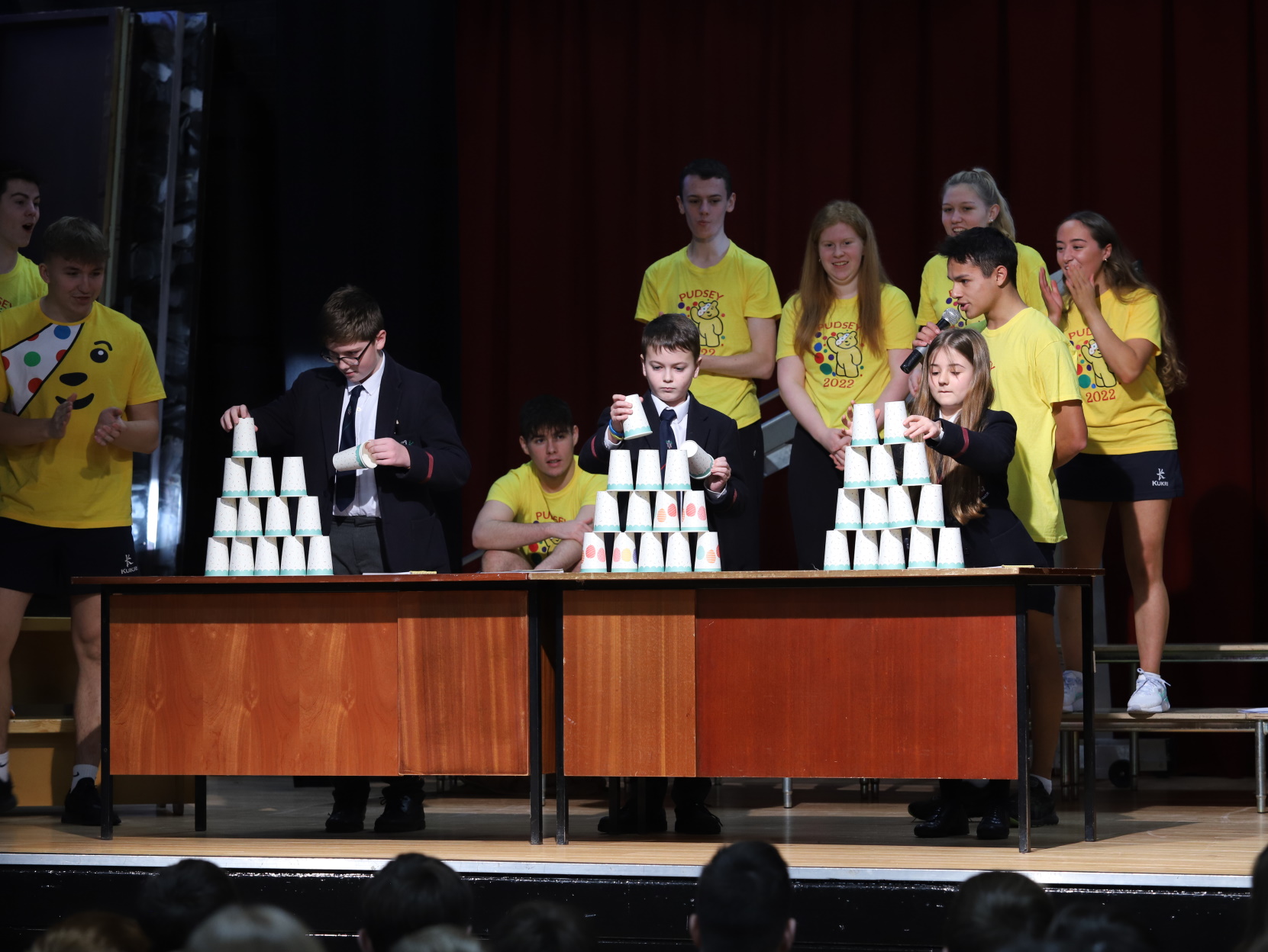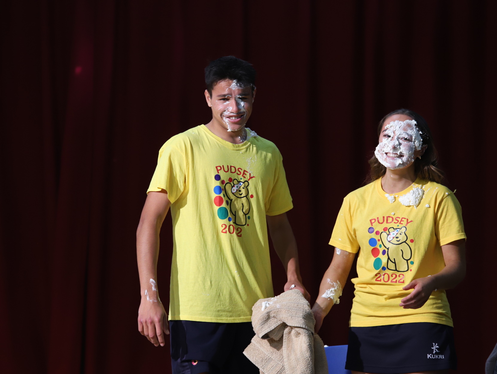 Years 8 & 9 had the pleasure of attending the Pudsey Games in the Assembly Hall which saw pre-recorded material featuring the Senior Prefect Team, a live Stack the Cups challenge, raffle results and the much anticipated cream pie fun. As befits the responsibilities of leadership our Head Boy and Head Girl, Josh and Samia, “took one for the team” and discovered the value of full fat cream for the complexion. Physics teacher, Mrs Wendy Davison, heroically stepped up for the staff and there’s no doubt that Seth Bovis, Rosie Boyd and Isabel Duncan enjoyed their moment in the limelight.