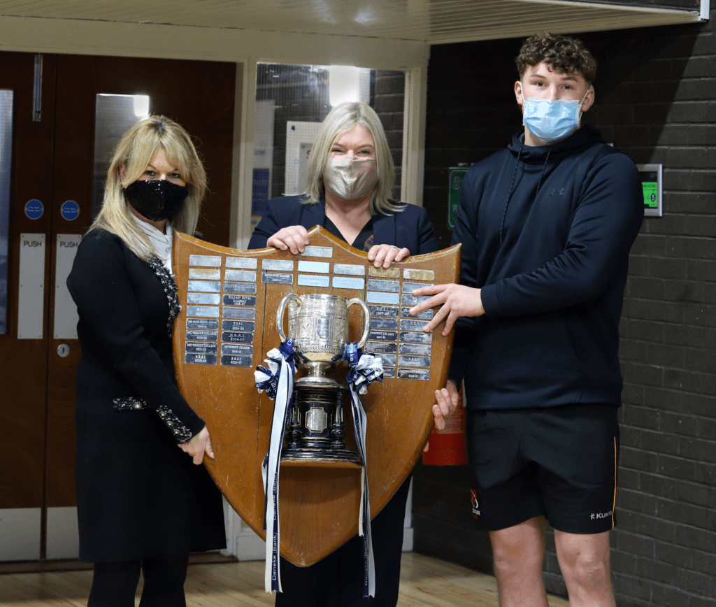 Nine months after the devastating announcement by the Schools’ Branch of Ulster Rugby that the hugely anticipated final between Wallace and Royal School Armagh was not to be played, a very special (and socially distanced) ceremony was held at Wallace to celebrate the achievement of the 1XV squad of 2019/2020. Captain Reuben Crothers had previously enjoyed the opportunity to hold the legendary cup aloft at a presentation organised by the Schools’ Branch and long-term sponsors Danske Bank but the absence of team-mates and coaching staff made it a very solitary and rather surreal experience.
