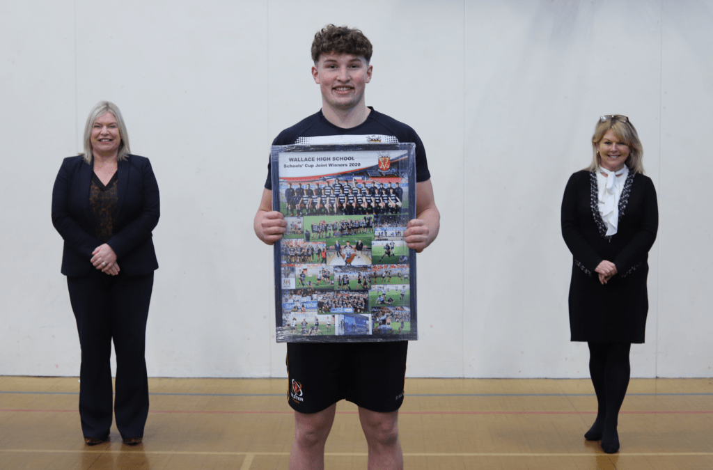 Head of PE, Mr Neil Hinds, had organised a ceremony for the team which saw them receive their medals, a team photograph and a poster featuring key moments of their triumphant road to Ravenhill ( now of course officially known as Kingspan but not in the minds of Schools’ Cup devotees) for the projected showcase final. The squad listened to a series of short speeches and presentations outlining various aspects of their achievement; Wallace’s Director of Rugby, former pupil Derek Suffern, highlighted some of the key values which had defined the squad noting in particular how few points had been scored against Wallace. Ben Best, who is a familiar and exceptionally popular figure in Wallace for his inspiring Tree of Knowledge presentations, has worked with the squad as a sports psychologist and surprised the boys with a witty poem . Mr Hinds highlighted the “unique legacy” this squad has gifted the school and thanked the Principal for her “unwavering support”. In turn Wallace’s Principal, Mrs Deborah O’Hare, reminisced about Mr Hinds (who is notoriously cautious in his pronouncements about possible success) being immensely excited when this team, as Year 8 students, defeated all comers. She commended the team for their “dedication” encouraging them to “remember the journey and the lessons learnt along the way” and thanked all the staff who had worked with the squad at each stage of their playing careers at Wallace.