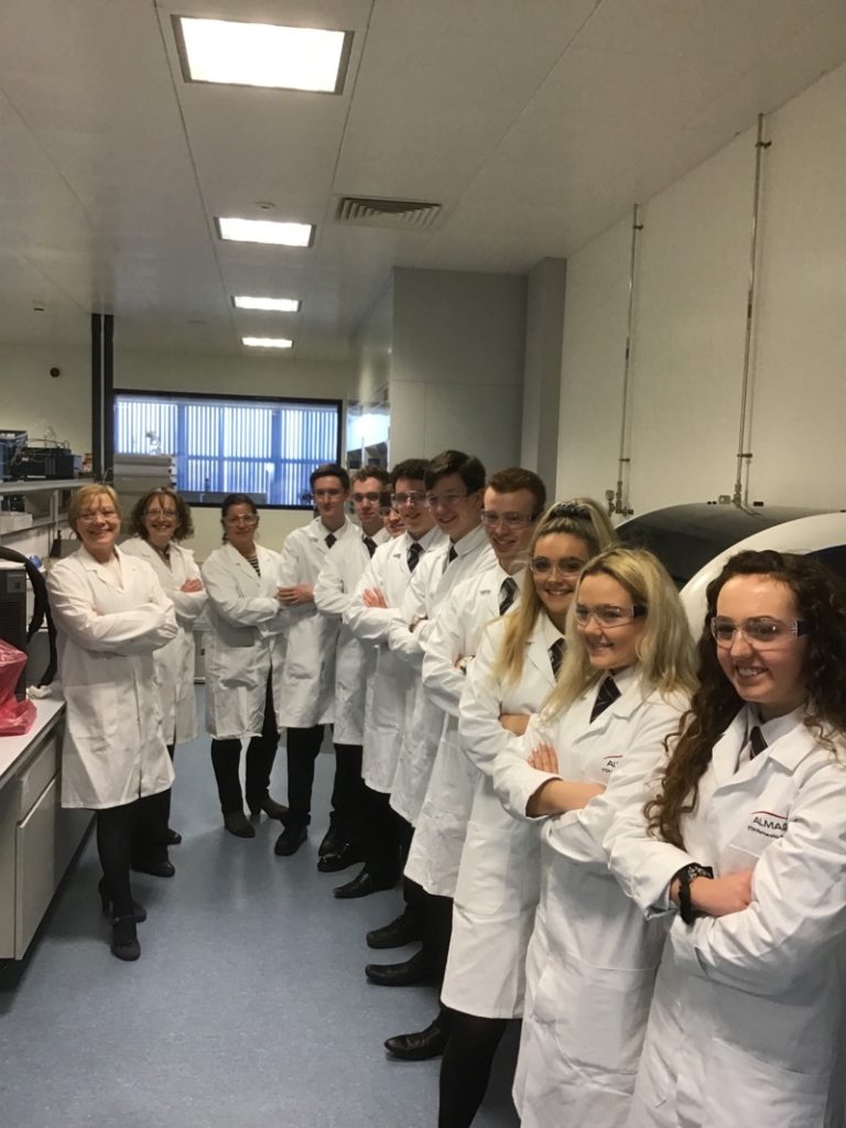 Once our products were synthesised we had a most successful visit to Almac Group’s global headquarters in Craigavon where our products were analysed by Dr Megan Smyth and Eilish Bonner. The teams were given a guided tour of the process development chemistry and analytical laboratories and the scale up manufacturing plant for active pharmaceutical ingredients.  There they witnessed exactly how the processes they developed would happen in industry. All students were fascinated by the machinery and differences to school laboratories and we all enjoyed a delicious lunch. Students within the teams have applied to study engineering,  pharmacy and many other STEM based career paths so this experience provided a valuable insight into an industry that is one of Northern Ireland’s largest employers.