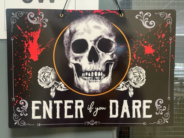 The English corridor echoed to the spooky sounds of screams, haunting moans and howling wind as a suitably atmospheric mood was created by Miss McGrath, whose room was bedecked with a warning sign, declaring “”Enter if you Dare”!